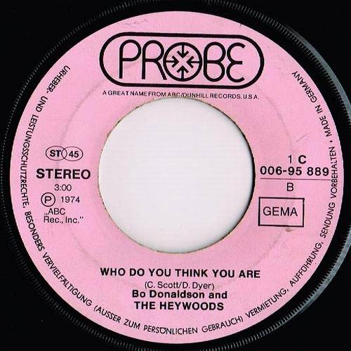 1974 German 7inch 45rpm single PROBE pressing, release number 1 C 006-95 889, by BO DONALDSON and THE HEYWOODS: Deeper And Deeper / Who Do You Think You Are. The track details are as shown on the images provided. The record has numerous partly effective sleeve-scratches & scuff-lines, otherwise still in a very good condition. The plain white sleeve is new. VG / M |