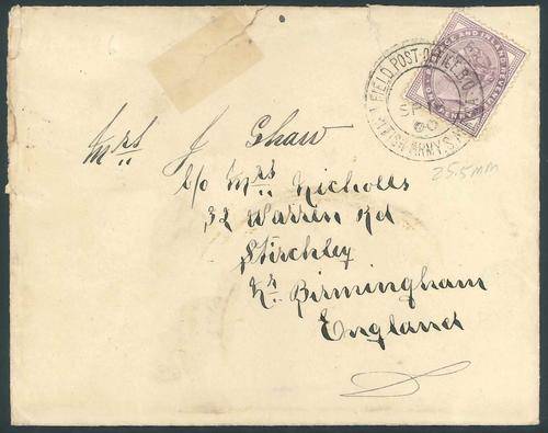 Interesting Boer War Cover which was sent from a British Army Field Post Office in Natal to Birmingham in England on the 18th of September 1900. The Cover is backstamped with an arrival "Birmingham" Postmark dated the 6th of October 1900. The Cover is in tatty condition with tears and crease marks so please see scans provided.