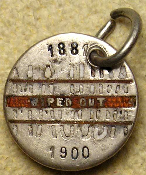 The front has the word: “MAJUBA” in tall white enamelled letters. Crossing this are three horizontal red enamelled bars. The central bar is thicker and within it has: “WIPED OUT” in white letters. In blue enamel above: “1881” and below: “1900”.