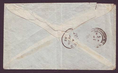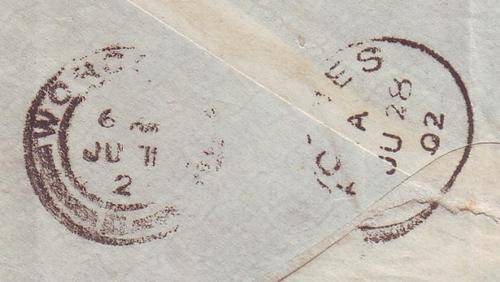 postmark Totnes(28 July 1902) at the back. Scarce cancel on cover.