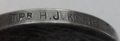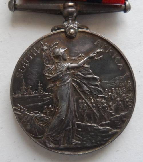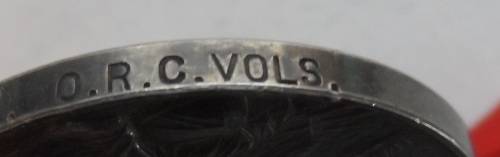 Boer War Era Queen's South Africa Medal, full size, silver, 3rd type reverse. Ribbon might not be original. Issued to: 265 Tpr. H.J. Kochemoer O.R.C. Vols. (Orange River Colony Volunteers)