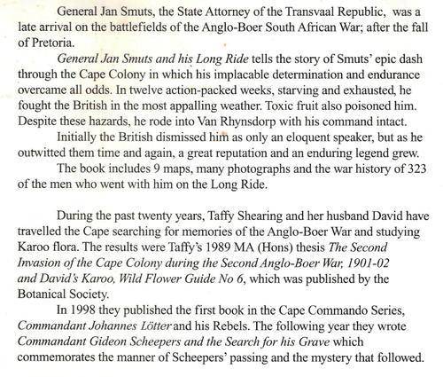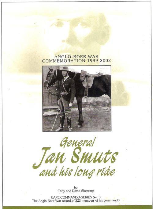 SHEARING, TAFFY & DAVID . General Jan Smuts and His Long Ride. (Cape commando series no. 3). Sedgefield: TAFFY & DAVID SHEARING, 2000. First edition. The epic journey by General Jan Smuts during the Anglo-Boer War is retold by Taffy and David Shearing who specialise in the Cape Colony's involvement during the ABW 1901-1902. 248 Pgs, 9 full page maps and 92 photographs. The war record of 323 of his men is included. The book is fully referenced. 170x240mm Tall. Very Good. Pictorial Laminated Wrappers.