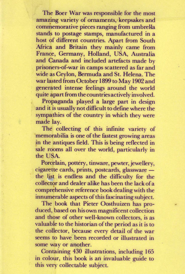 Boer War Memorabilia: The Collectors' Guide by Pieter Oosthuizen, The Alderman Press, 1987. A splendid work which documents with photographs the extraordinary variety of ornaments, keepsakes and commemorative pieces produced from around the world associated with the Boer War