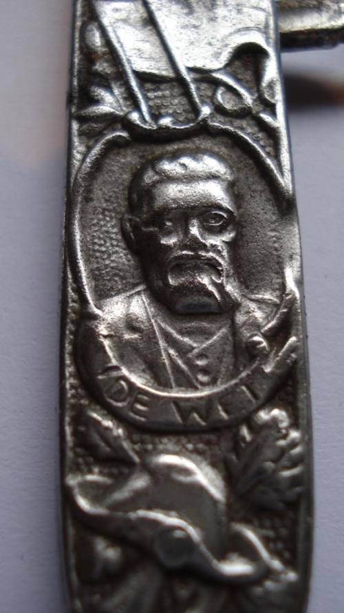 This beauty has the embossed portraits of TRANSVAAL PRESIDENT PAUL KRUGER and BOER GENERAL CHRISTIAAN RUDULF DE WET and two flags on the one side of the handle, the other side is engraved with the phrase "Eendracht maakt Macht " and the emblems of the TRANSVAAL and ORANJE-VRIJST.