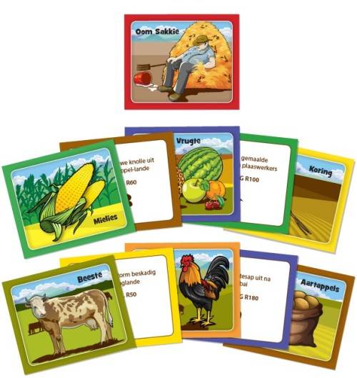 Elke bord het plek vir 10 kleurkaarte wat elkeen teen ‘n prys aangekoop kan word: Oom Sakkie, die plaasvoorman @ R20; Die Plaashuis, oftewel woning op die Boer se plaas @ R1500; Trekker @ R460; Beeste @ R300; Hoenders @ R80; Mielies @ R200; Koring @ R120; Aartappels @ R80; Vrugte @ R60 & Groente @ R40.