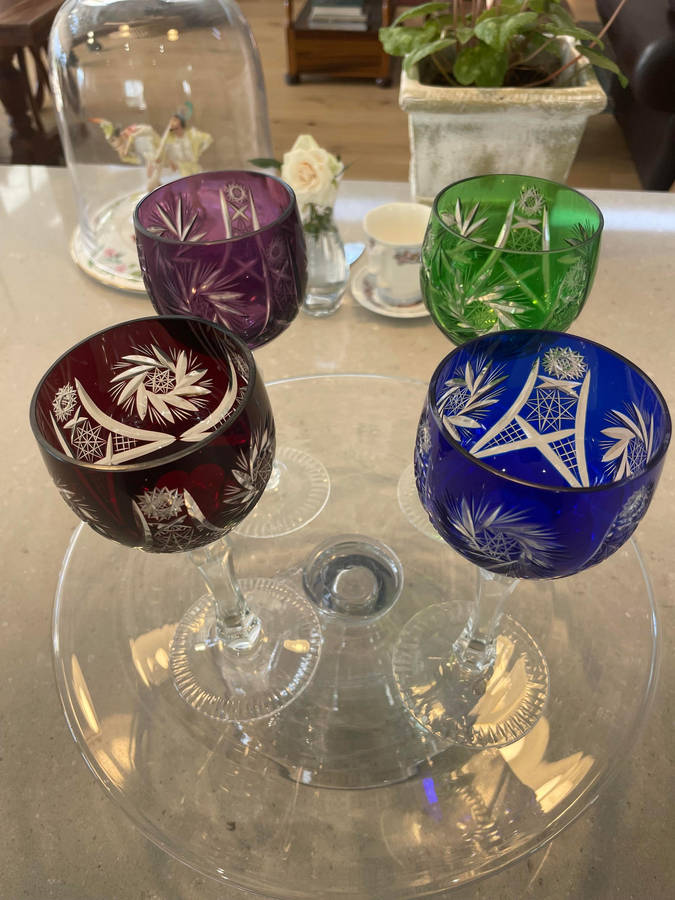 4 x Bohemian Crystal Wine/ Glass Goblet Hock. Apple-Shaped cupola with 3 fans, three stars within stars, star of David and swags. Even more stars!! (The only designed whose designs are mostly based on stars is Graflich Schaffgotsch'che Josephinenhutte, Schreiberhau (Szklarska Poreba) Silesia, Poland. Produced in the 1920's. This I cannot confirm but after much researched it will be my conclusion.
