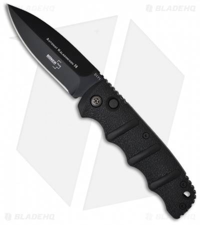 This limited edition knife has a tactical black finished blade, handle, hardware, and pocket clip. The AUS8 stainless steel blade is double-edged with just one edge sharpened (the other edge is used to fold the blade closed). The ergonomically shaped handle is black finished aluminum with molded finger grips and jimping where the handle and blade meet. The design is thin, elegant, and comfortable. The action of this knife is first rate and comparable to that of the Boker Magnum series. As with other Kalashnikov knives, this knife comes with a pocket clip for easy, tip-up carry.
