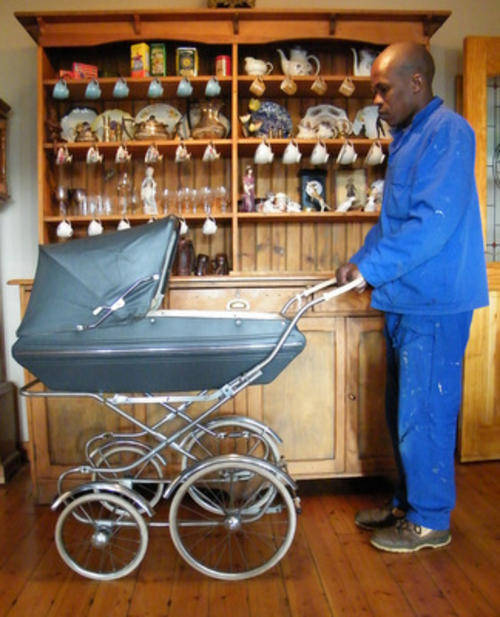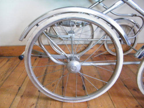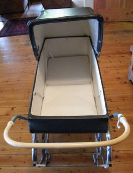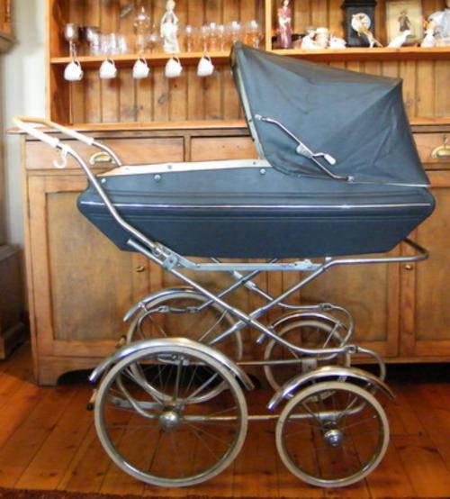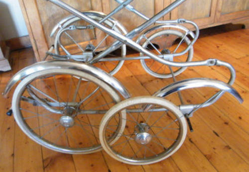 On offer this fabulous Vintage Big Wheel Rocking Pram, an Impressively Large Pram (see the very last photo for perspective on the size of the pram). It is marked "Bologna, Italy, Trevetatta" on the nappy bag hook on the handle and the wheels marked "Penguin". It pushes like a dream and will lull baby to sleep with it's brilliant suspension. One does not often see these vintage prams with the attractive chrome mud guards as this one has, and they are in really good condition. Overall it is in good nick, the brakes work, the wheels come off by the press of a lever (for easy storage), the bassinet lifts off nicely by unlatching some hooks, and the adjustable back rest works as well. There are a few spots of chrome wear, mostly on the lower bits but the chrome on the mud guards in good condition. There is a small tear on the hood on the inside on one side, in the same area on the opposite side the hood has come slightly loose from the frame. A couple of some other minor blemishes, detailed in the photos below, but these are small blemishes compared to the overall beauty of this beautiful pram. Measurements: 114cm to the top of the hood, 96cm to the top of the handle. about 110cm long, Basonette: 92x38cm and 24cm deep, Wheels: the larger ones have a diameter of 39cm, the smaller ones have a diameter of 29cm. Weight: About 17.5kg. It is navy on the outside and off-white/cream on the inside. These prams are very scarce and highly collectible especially in the good condition this one is in, bid while you still have a chance to own one of these vintage treasures!