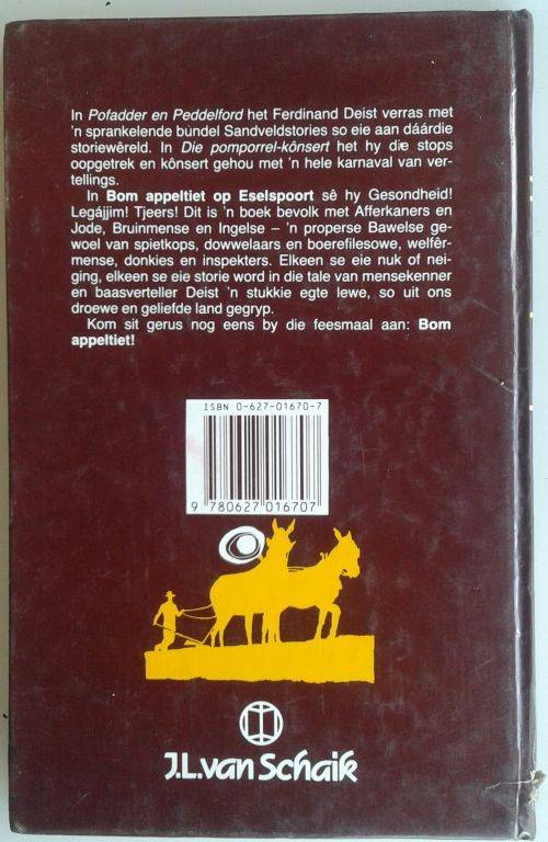 Bom appeltiet op Eselspoort deur Ferdinand Deist. Klein stukkende plekkie op rugkant en naam van vorige eienaat voor in boek maar verder goed.