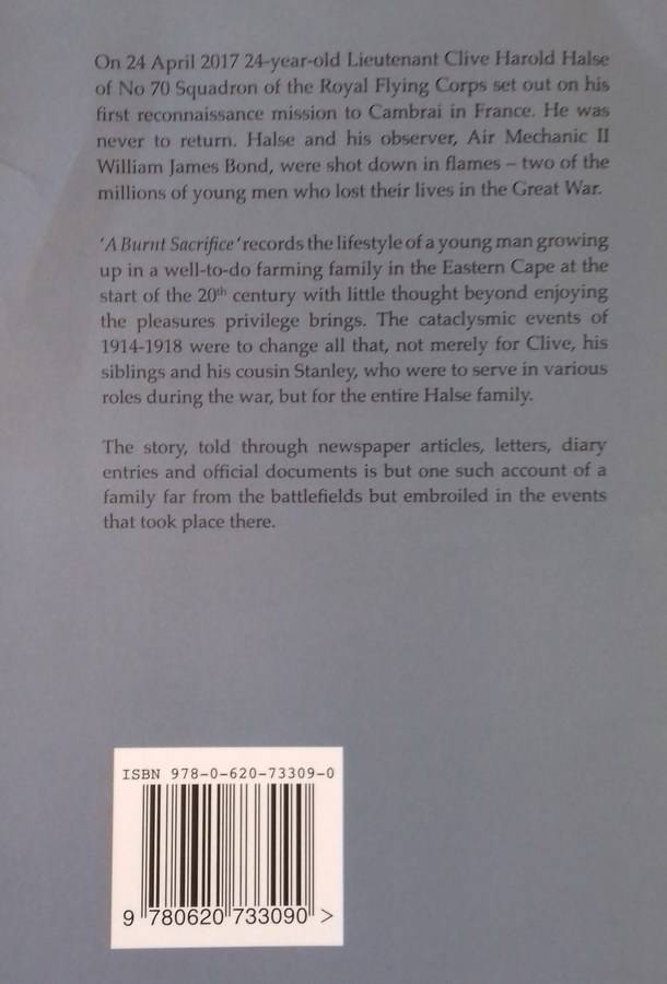 Records the life of Clive Harold Halse, who grew up in the Eastern Cape. In 1914 he signed up and served with Cullinan's Horse in German South West Africa before training with the Royal Flying Corps and qualifying as a pilot. A lieutenant of No 70 Squadron, he was shot down on his first reconnaissance mission to Cambrai in France on 24 April 1917.