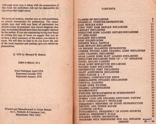 BOOK OF HI FI LOUDSPEAKER ENCLOSURES BY B.B. BABANI PAPERBACK 1978
