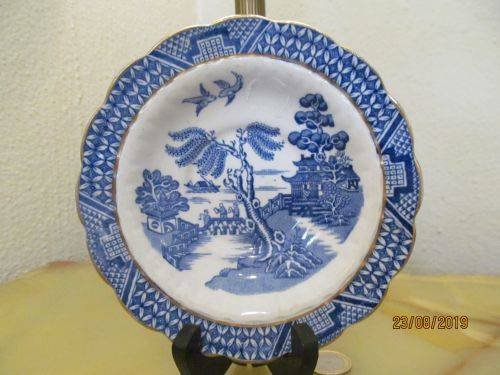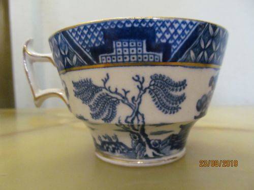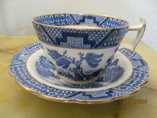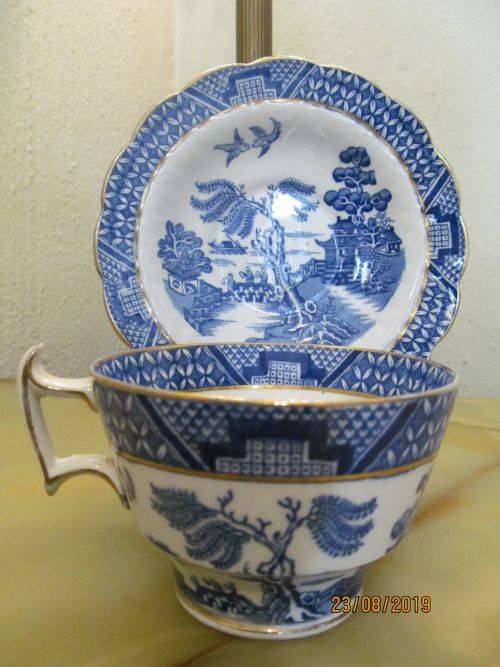 RARE ANTIQUE 1906+ BOOTHS Ltd, TUNSTALL BLUE WILLOW CERAMIC TEA DUO WITH GOLD TRIM
