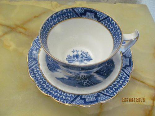IN SUPERB CONDITION, THIS LOT/SET IS A COMPLETE CERAMIC BOOTHS Ltd TEA DUO MANUFACTURED DIRECTLY AFTER 1906 AND DECORATED IN THE COLLECTABLE, POPULAR AND SOUGHT AFTER BLUE WILLOW PATTERN ALONG WITH GOLD TRIM UPON BOTH THE SAUCER AND TEACUP