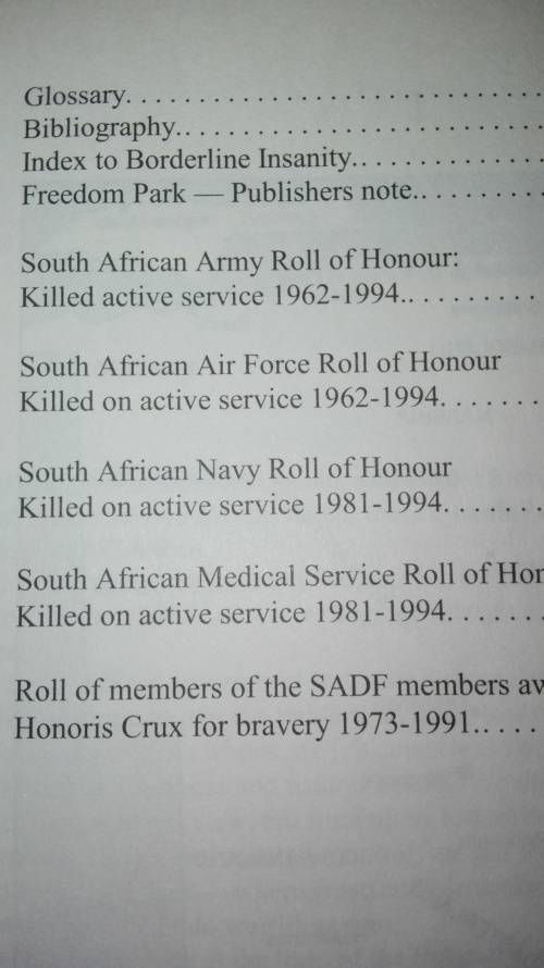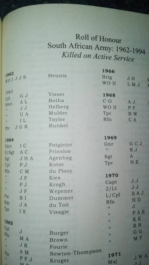 ( Roll of Honour - Those killed in Active Service split between the South African Army 1962 - 1994 ; The South African Navy 1966 - 1994 ; The South African Air Force 1962 - 1994 and the South African Medical Service 1981 - 1994 ) copyright Peter Stiff .