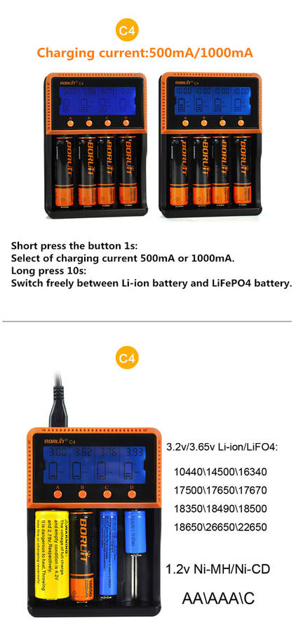 Short press 1S: Select of charging current 500mAh or 1000mAh(make sure of your battery can be fully and quickly charged). Long press 10S: You can switch freely between Li-ion Battery and LiFeP04 battery.