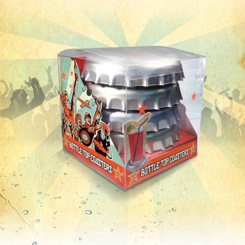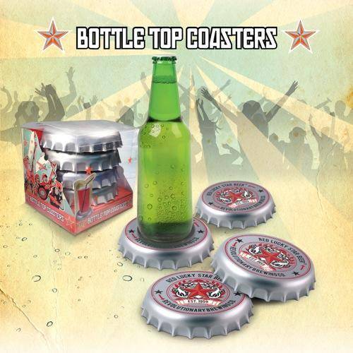 Each coaster resembles an intriguingly oversized bottle cap, complete with authentic looking drink's logo and details.