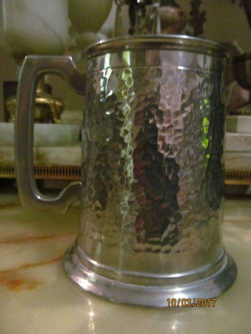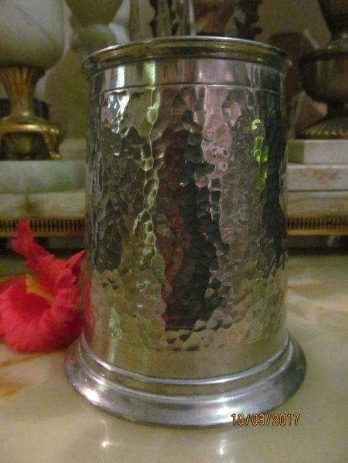 A Graduated circular base with a glass bottom and a classical Edwardian Style handle decorates this SUPERB Beer tankard which not only has a fantastic beaten metal pattern across the surface, but also has a smooth rectangular portion left blank for an engraving of YOUR choice.