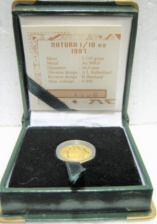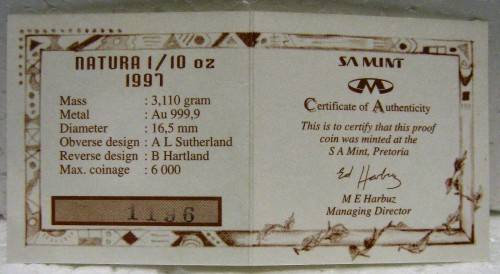 BOXED ENCAPSULATED SOUTH AFRICAN MINT 1997 NATURA 1/10 OUNCE PROOF BUFFALO COIN WITH CERTIFICATE