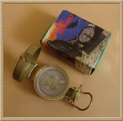 Boxed Lensatic Green Marching Folding Compass with Scale Rule, closed size 7.5cm diameter, in excellent condition.