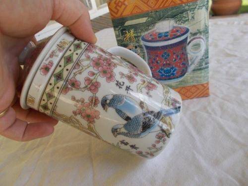 stunning oriental porcelain tea mug with a tea infuser item is boxed looks like never been used please note I have three the same of these which I will list separate on my site