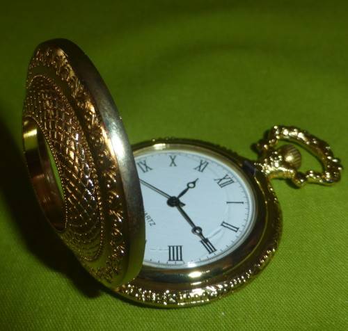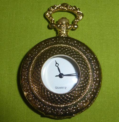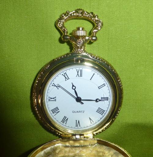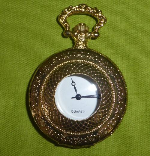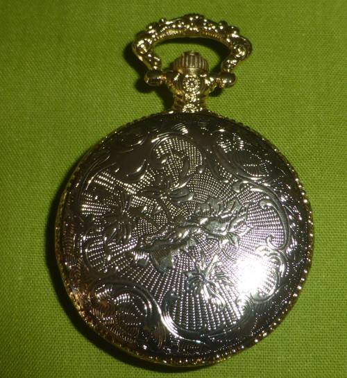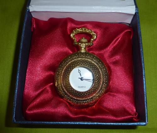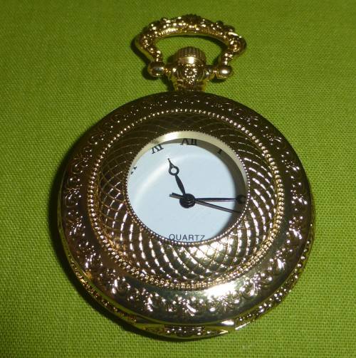 This pocket watch is brand new! A lovely gift! It is a shiny gold colour. Average size of all our pocket watches is around 5cm wide and around 6,5cm high.