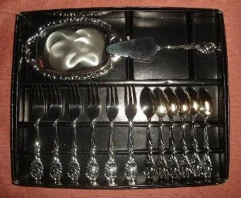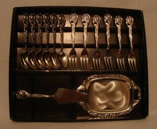 A LOVELY BOXED AND UNUSED ROSE HANDLE CAKE SET, CONSISTING OF SIX SPOONS, FORKS, ONE CAKE LIFTER AND TWO TRAYS, ALL IN EXCELLLENT CONDITION. spoon height 115mm,