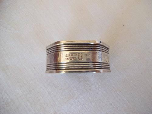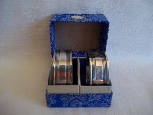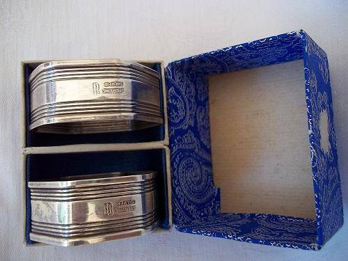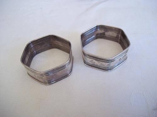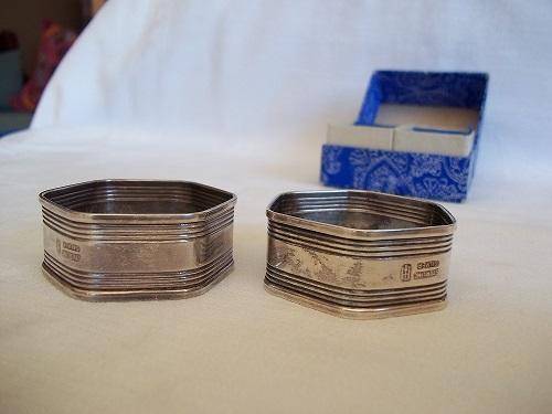 Boxed set of 2 Sterling Silver art deco napkin rings. This lovely set are hexagonal with the classic horizontal lines. They are hallmarked Stirling Silver, and I would date them to the 1930s. They weigh 30.3g in total, and are in lovely condition for their age. Great buy for your dinner table.