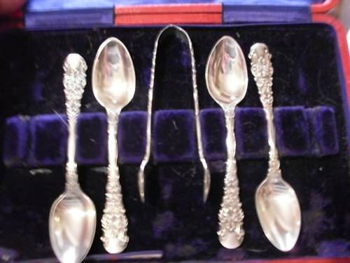 BOXED SET OF 4 HALLMARKED SILVER TEASPOONS AND A SUGAR TONG...47.17 GRAMS