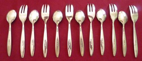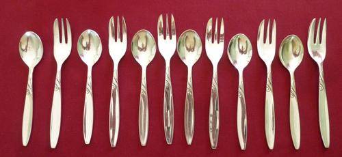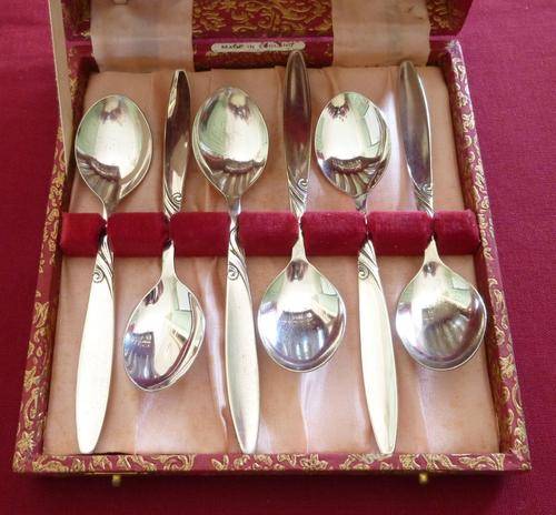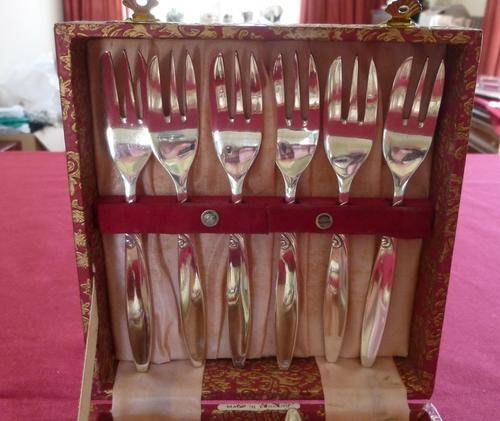A good set of six silver plated tea spoons and six silver plated cake forks in an attractive 1950s pattern. The spoons measure 12.5cm, the forks 14cm. There is some wear to the plating on three of the spoons and on the back of four of the cake forks spoons, but the pieces still present well. I have listed separately a matching set of six more teaspoons.