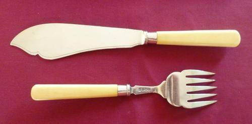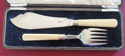 A lovely boxed set of solid silver fish servers with bone handles assayed in Sheffield in 1919. The knife measures 30cm, the fork 12.5cm and they weigh 221 grams. The servers are in very good condition, there are some minor scratches to the leather bound box but these do not detract.