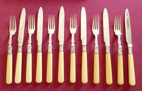 A good quality Victorian bone handled and silver plated fruit set for six in a silk lined leather box. The knives measure 21cm and the forks 18.5cm. The set is in very good condition and looks to have had very little use.
