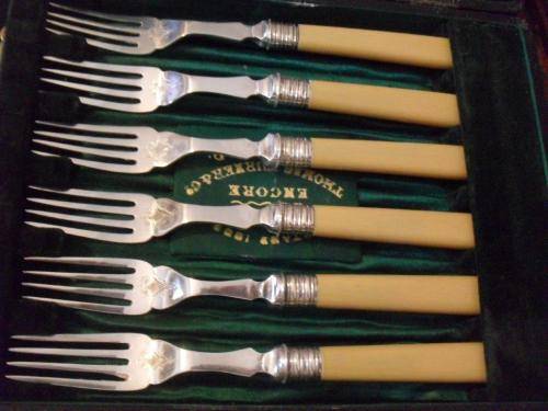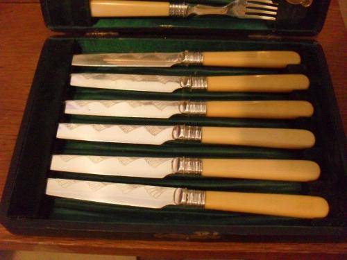 WHAT A NICE FIND....(1905-1926 )VINTAGE BOXED THOMAS TURNER & CO SHEFFIELD BONE HANDLE EP 6 X FISH FORKS AND 6 X KNIVES.....