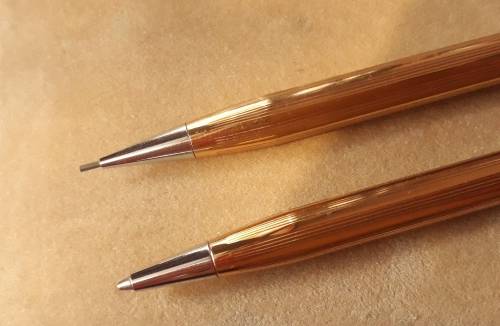 This elegant pen and pencil set is in its own beige velvet box. The lid is lined in a cream satin material with the Bradley brand name printed in gold. The pen still writes and there is a pencil lead in the pencil. There are no stamps on the pens except for the name Bradley on the clips of both the pen and the pencil.