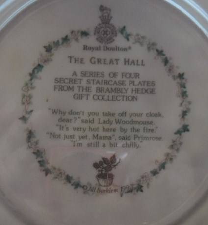 BRAMBLY HEDGE THE GREAT HALL IS A SERIES OF FOUR SECRET STAIRCASE PLATES FROM THE BRAMBLY HEDGE GIFT CO LLECTION.THESE PLATES ARE BEAUTIFULLY DETAILED .THE ARTIST NAME IS ON THE BACK OF THE PLATE. JILL BARKLEM 1990.MADE BY ROYAL DOULTON ENGLAND. POSTAGE WILL BE R4O. THE PLATE IS IN MINT CONDITION.DIA 20.5 CM.