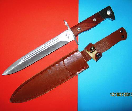BRAND NEW AK 47 BAYONET WITH SCABBARD. BLADE IS 19,5 CM LONG. SPRING-LOADED DEVICE FOR ATTACHMENT TO RIFLE FITTED.