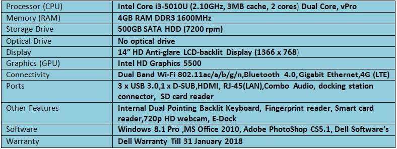 4GB RAM(1600 MHz),500GB HDD (7200 rpm),14" HD Anti-glare Display(1366X768), Dual Pointing backlit keyboard,Fingerprint Reader,4G(LTE)