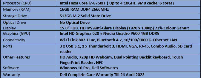 16GB DDR4 RAM(2666 MHz),512GB SSD ,15.6" FHD IPS Display(1920X1080p), Backlit Keyboad, Nvidia Quadro P600 4GB DDR5 Graphics