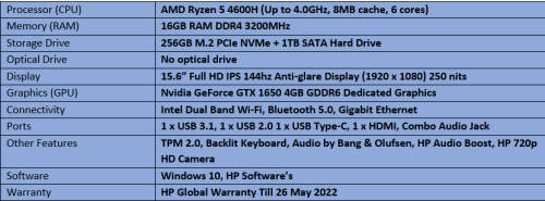 16GB DDR4 RAM(3200 MHz),256GB SSD + 1TB HDD,15.6" FHD IPS 144Hz Anti-Glare Display(1920X1080p), Backlit Keyboad
