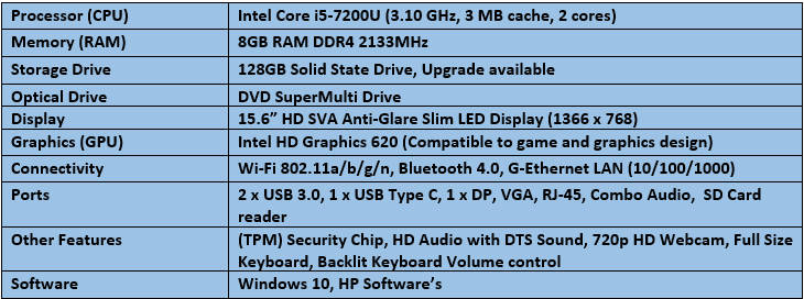 8GB DDR4 RAM(2133 MHz),128GB SSD,15.6" HD Display(1366X768),Full Size keyboard, Windows 10, Backlit Keyboard