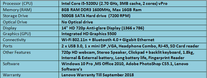 8GB RAM(1600 MHz),500GD HDD,14" HD Anti-glare Display(1366X768),Spill-resistant keyboard,Internal & External battery