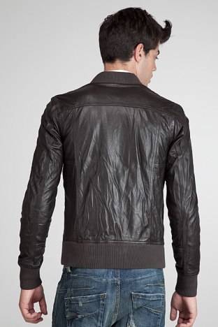 SUPPLE DARK BROWN LEATHER BOMBER JACKET WITH RIB KNIT COLLAR, SLEEVE CUFFS AND WAISTBAND. SNAP WELT POCKETS AT WAIST. TONE ON TONE STITCHING THROUGHOUT. FULLY LINED. SHELL: 100% LAMB LEATHER.