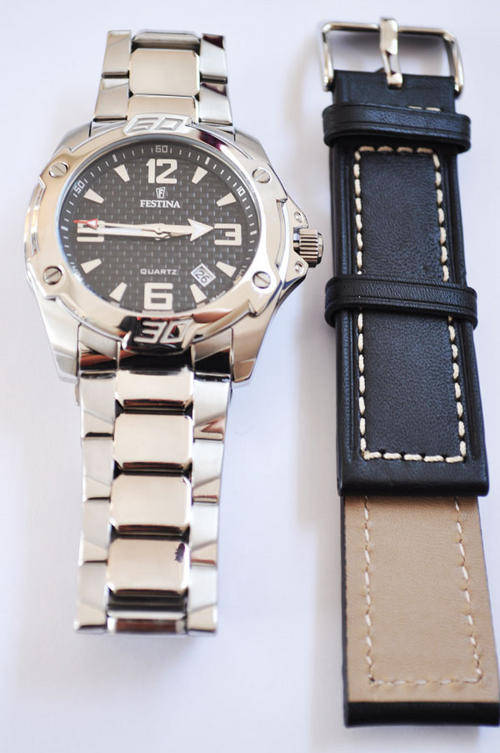 This statement and sporty stainless steel FESTINA watch is supplied complete with a black leather interchangeable strap with white stitching replacement and buckle.Features include date function, scratch resistant mineral glass , band of matte and polished elements, textured dial, folding clasp, Silver hands, second hand, Water resistant to 10 ATM.