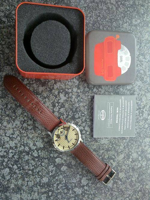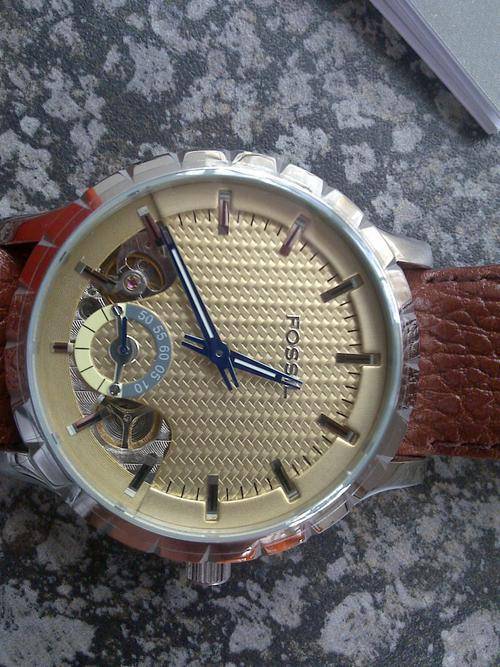 This Fossil watch has a beautiful polished silvertone stainless steel bezel (48mm).The watch features forked cobalt blue hour and minute dials and polished silvertone stainless steel hour markers.It also has a genuine leather strap made from soft brown leather!