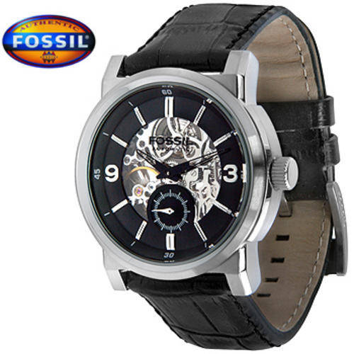 The Fossil ME3003 watch features a 45mm (1.77") solid silvertone stainless steel case with a see-through exhibition caseback, a precise Japanese 20-Jewel Automatic Miyota movement, skeletonized dial with black index, silvertone hands, numerals and hour markers, a handsome seconds subdial located at the 6:00 hour position and a water resistance of 50 Meters (165 Feet - 5 ATM). The watch rests comfortably on your wrist with its genuine black crocodile patterned leather strap, secured by a stainless steel buckle clasp.a solid stainless steel crown with function pushers, an easy-to-read date display window located at the 3:00 hour position and a scratch resistant hardened mineral crystal. Rating water resistant to 100 Meters (330 Feet - 10 ATM), the watch rests comfortably on your wrist with its brushed and polished solid silvertone stainless steel triple-link bracelet secured by a push-button safety deployment clasp.