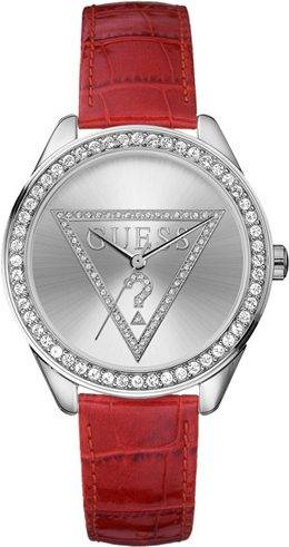 Yet another fantastic design by Guess, model W65006L5. This Beutiful Ladies Guess watch features a red textured leather strap with a buckle clasp. The large silver dial has a prominent Guess logo and crystal detail. All Guess watches arrive with a manufacturers 2 Years, packaging and instructions for adjustment and use.