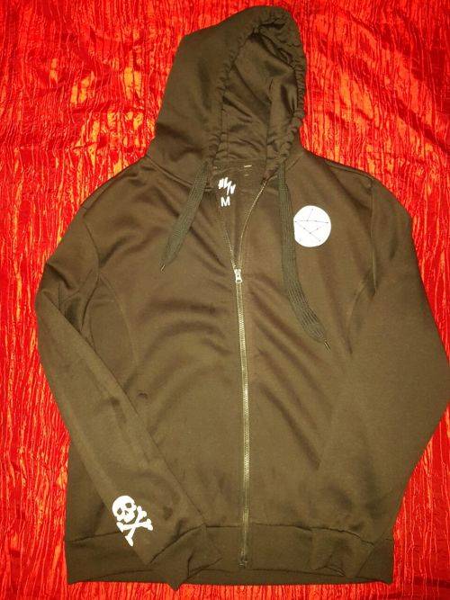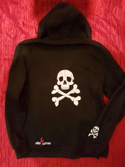 Cotton Poly unisex hoodie with front zip- white pentagram print on left front, large white skull and bones print on back, small skull n bones print on right wrist - and "High Voltage" logo print back left- good quality, stunning and warm!