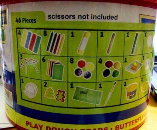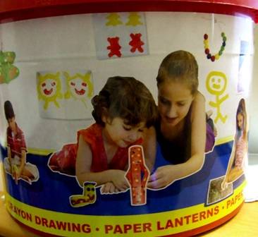 GLUE AND, GLITTER GLUES, PAINTS, COLOURED PAPERS, PIPING, MOULDS, PAINT BRUSHES. ALL THIS IN A LARGE BUCKET