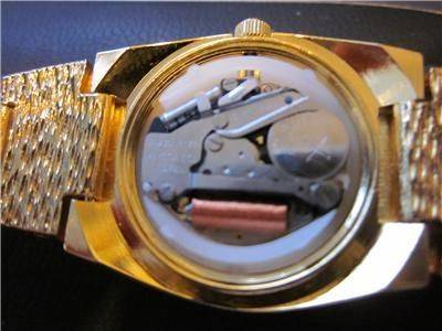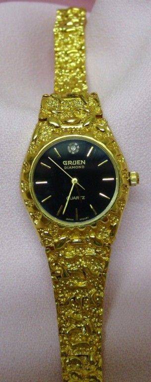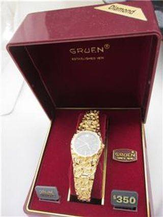 "Gruen Diamond Quartz Japan GR2087". The face is surrounded by a gold tone textured case and measures 25mm excluding crown by 30mm lug to lug. The textured gold tone band measures 170mm in length. The clasp snaps tight. The caseback is stainless steel and reads "Gruen Since 1874 259-2033 Water Resistant Stainless Steel Back Base Metal Bezel".