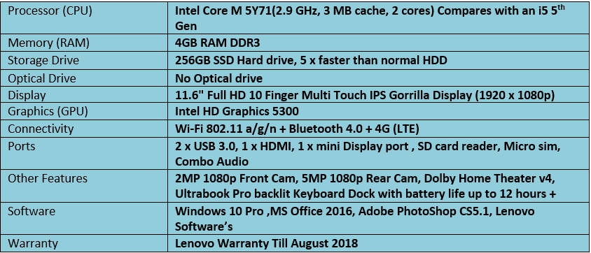 4GB RAM(1600 MHz),256GB SSD,11.6" FHD Touch IPS Display(1920X1080p),Spill-resistant + backlit keyboard,3G, Front & Back Camera