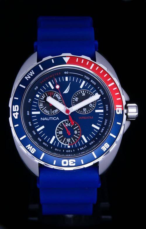 Dark Blue Dial with Luminous White Hour & Minute Hands & Red Sweep Second Hand. 3 Black Sub-Dials for Day, Date & 24 Hour Time Display. Tachymeter Scale on Raised Sides of Dial in Red/White Accent. Tachymeter Scale on Raised Sides of Dial. Scratch Resistant Hardlex Crystal. 3 Sub-Dials for Day, Date & 24 Hour Time Display. Crown with Nautica Logo . 165Ft (50m) Water Resistant
